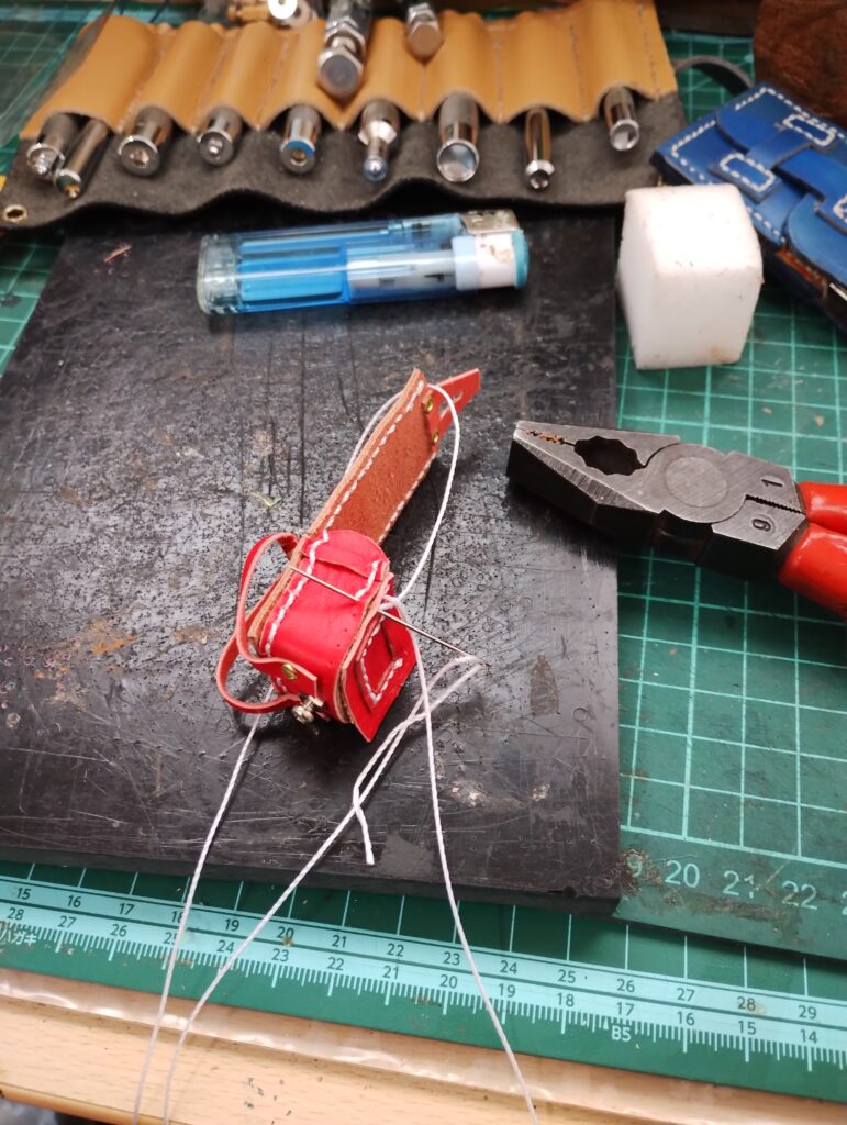 赤のクロム革0.8mmフニャフニャなので裏張りの生成りヌメ革は1.2mmにして貼り合わせ。