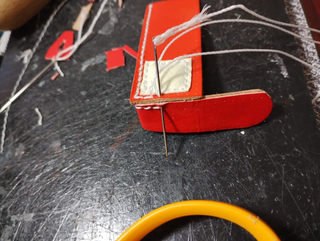本体に背当てを縫い合わせた後ランドセル側面と駒合わせ縫いをしていく。駒合わせ縫いも久しぶりで、自作のかぎ針で下穴を開けてから90度の角度で糸を通していく。ミニミニなので硬くて非常にやりにくい。注意しないと革が切れてしまう。