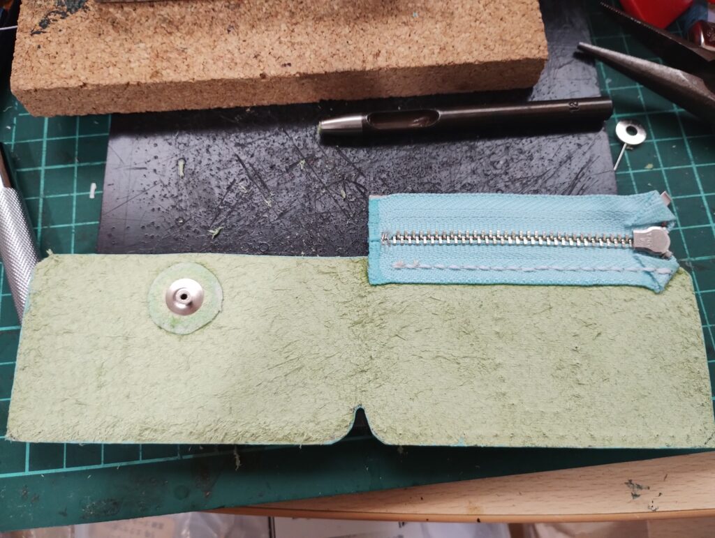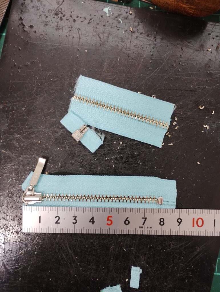 8cmのファスナーがないので、16cmのファスナーを切り詰めて上部下部のストッパーを詰めた。