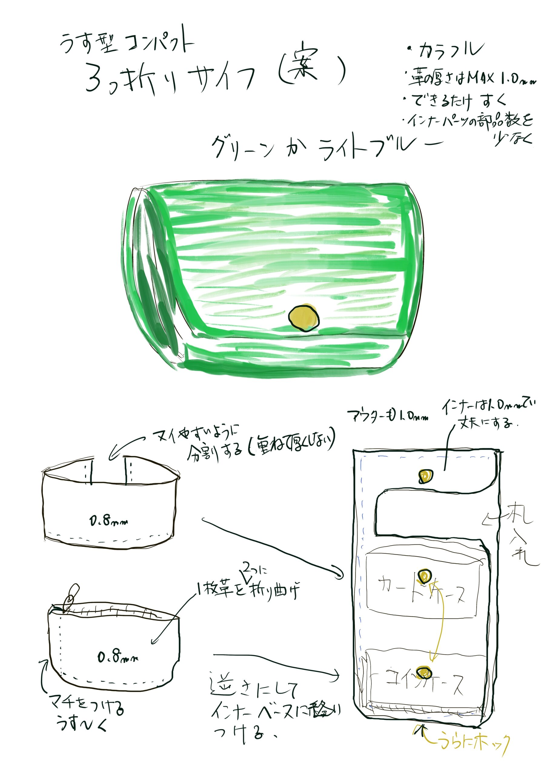 まだ、デザイン考案中ですが、三つ折り財布はどうしても挑戦しなければならない問題だと思っていた。