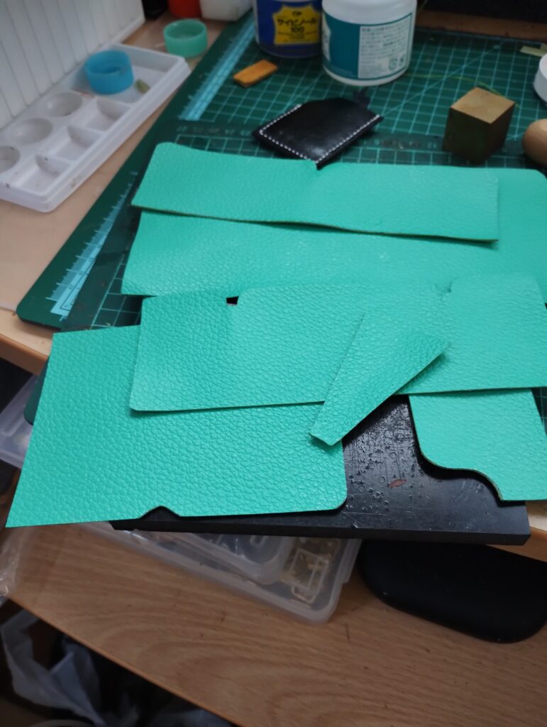 革材は牛革シュリンク型押ティファニーブルー1mm(柔らかめ)から切り出し、コインポケットとカードケースとマチは0.8mmくらいに漉き、インナーベースに縫い付け、最終的にアウター外周にインナーベースを縫い付けることにした。