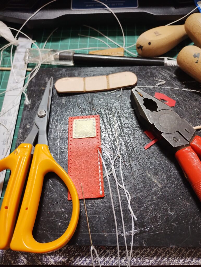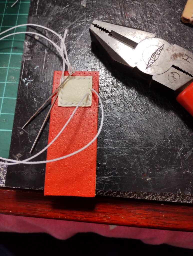 本体に背当てを縫い合わせた後ランドセル側面と駒合わせ縫いをしていく。駒合わせ縫いも久しぶりで、自作のかぎ針で下穴を開けてから90度の角度で糸を通していく。ミニミニなので硬くて非常にやりにくい。注意しないと革が切れてしまう。