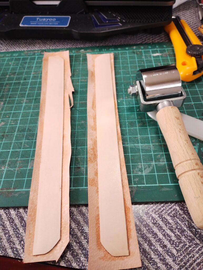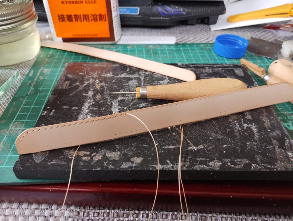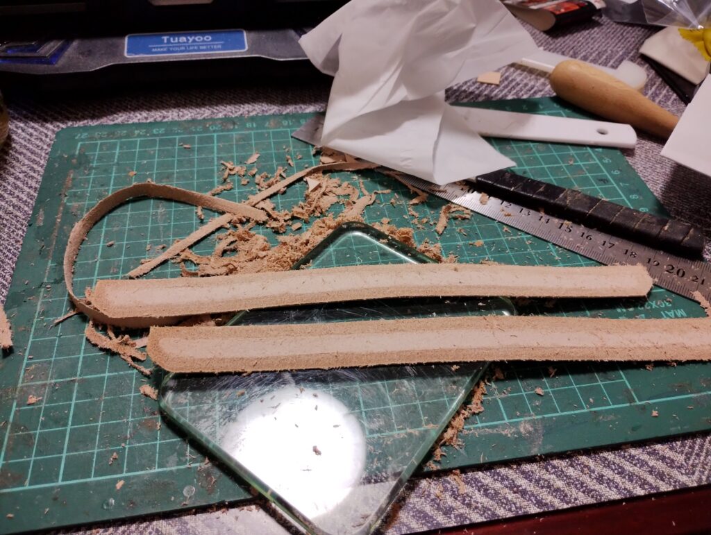 これは、作成時にもに気にしていたが、インナー部分に取り付けたリングガードに芯材を入れて弾力性を設けたが、そこまではいらないので、0.8mmの裏表を貼り合わせ外周を漉いただけにした。